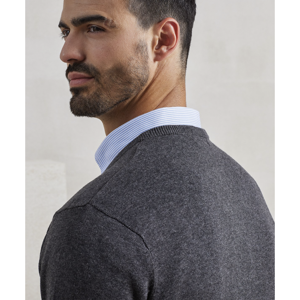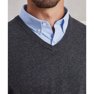 A V-neck long sleeve men's sweater made with a fine gauge knitted cotton rich yarn for a soft and comfortable feel. The set in sleeves and hem give a contemporary feel to the jumper making this a great piece to layer up over a shirt.